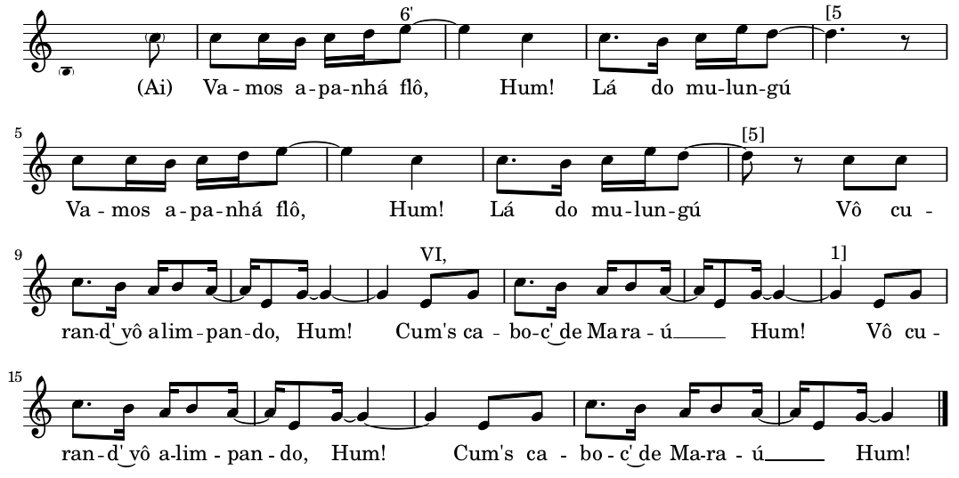 Há uma irregularidade métrica das frases. As duas primeiras são formadas por 4 compassos e são téticas (apesar de um levare inicial que não é repetido). A terceira frase é de 6 compassos com levare. A última de 5 compassos e meio. É interrompida e recomeça a música do princípio, sem levare.
